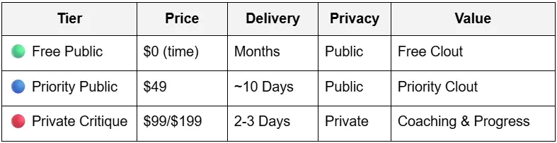 - Standard Private Critique - Send up to 3 questions.